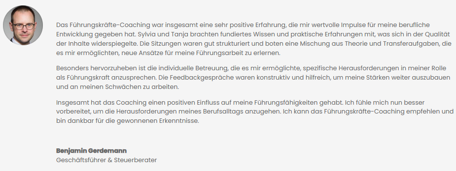 - Durch das im Rahmen der 6monatigen Begleitung entstandene Führungssystem hat sie Struktur und Klarheit für ihre Führung gefunden und kann dadurch nachweislich bei ihren Teams mit ihrer Führung etwas bewirken.
