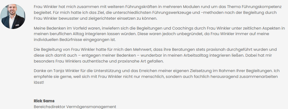 Frau Winkler begleitet die Vertriebs-Führungskräfte unseres Hauses seit mehreren Monaten zum Thema Führungskompetenz. Unser Ziel hierbei war die Etablierung eines einheitlichen Führungsverständnisses und die Stärkung der individuellen Führungskompetenz. Unsere Führungskräfte sollten wirksame und nachhaltige Techniken für ihren Führungsalltag an die Hand bekommen. Wichtig war uns, dass die Inhalte praxisnah vermittelt werden und die Teilnehmer das Erlernte auch nachhaltig vor Ort in ihrem Führungsalltag umsetzen können.Die Führungskräfte haben durch die Begleitung von Frau Winkler profitiert, da sie den Einsatz der verschiedenen Führungswerkzeuge unter Berücksichtigung ihrer individuellen Situation trainieren konnten.Bei den Teilnehmern kam vor allem gut an, dass die Führungswerkzeuge sehr praxisorientiert vermittelt wurden und so im Berufsalltag auch wirklich eingesetzt werden können. Die Kollegen haben den Mehrwert für sich und ihre Mitarbeiter erkannt!Ich schätze an Frau Winkler, dass sie zu jedem Mitarbeiter eine sehr gute Beziehungs- und Vertrauensbasis herstellen kann und sich die Kollegen dadurch auf die angestoßene Veränderung trotz erster Skepsis einlassen. Vielen Dank an Tanja Winkler für die stets gute und offene Zusammenarbeit! Es ist eine tolle Basis für künftige Themen entstanden.