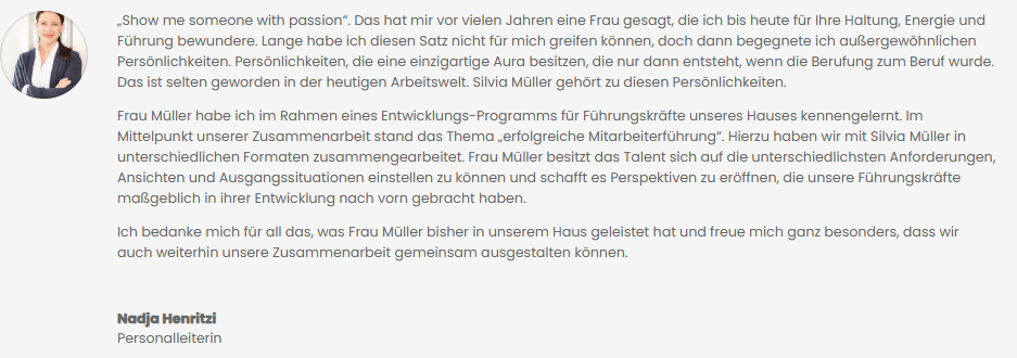Ich hatte die tolle Chance, an einem Führungstraining bei Frau Müller teilzunehmen und bin begeistert von ihrer Expertise und ihrem praxisnahen Ansatz. Ihre Fähigkeit, komplexe Themen verständlich zu vermitteln, hat mir geholfen, meine Führungskompetenzen nachhaltig zu verbessern. Besonders beeindruckend ist ihr Talent, auf individuelle Bedürfnisse einzugehen und konkrete Lösungsansätze anzubieten. Ich kann Frau Müller jedem empfehlen, der seine Führungskompetenzen auf das nächste Level bringen möchte.